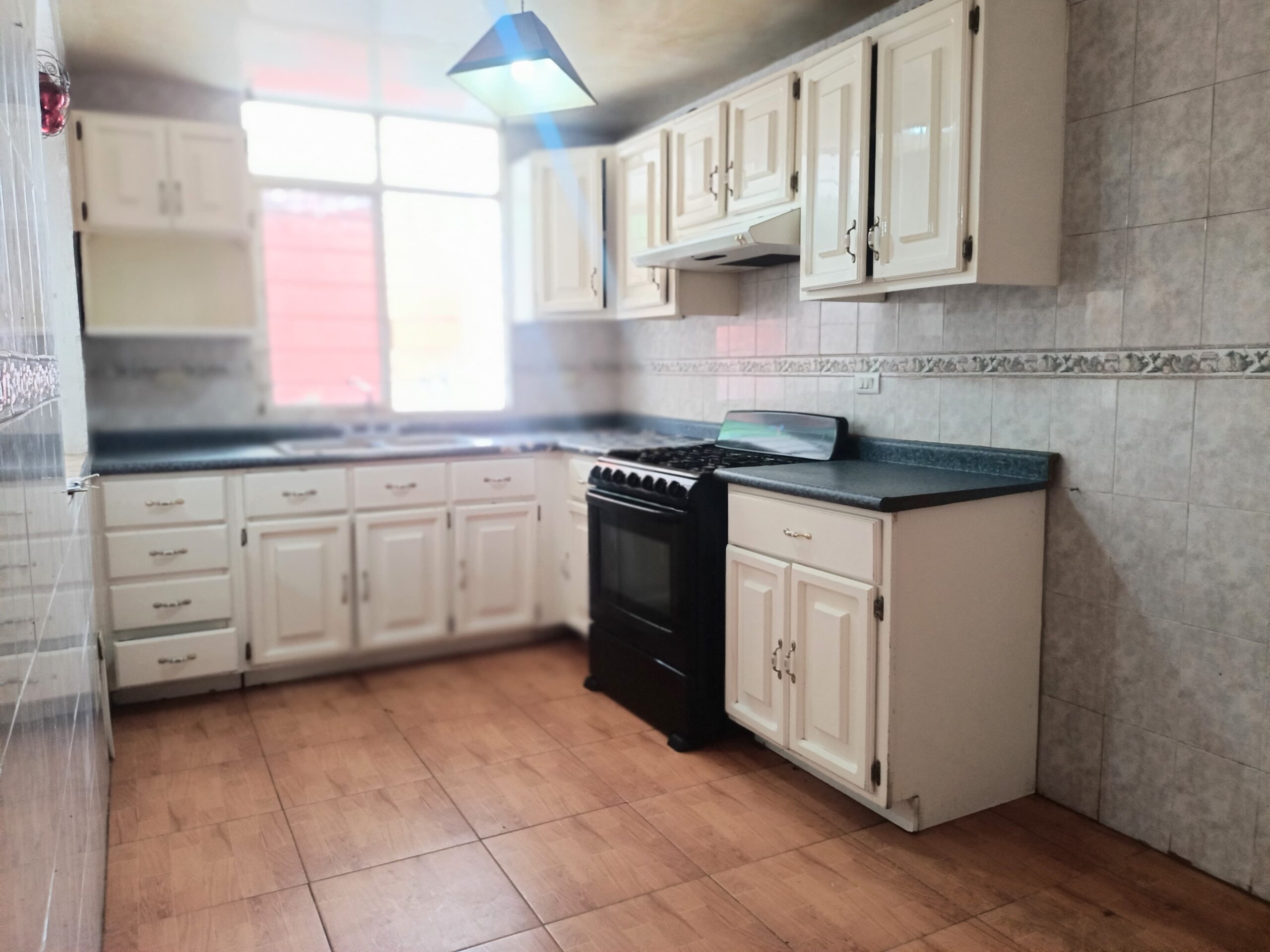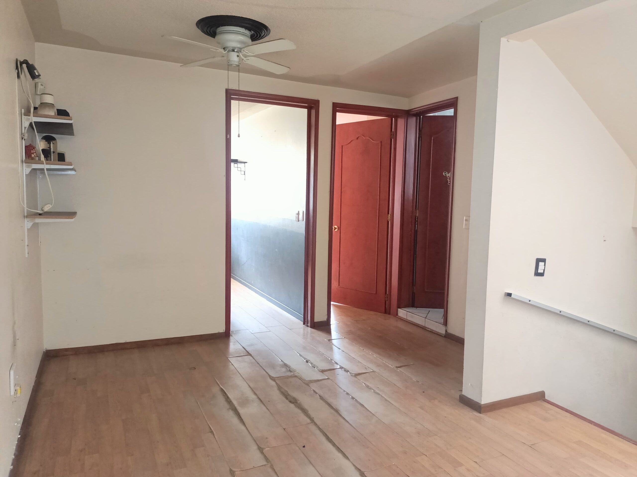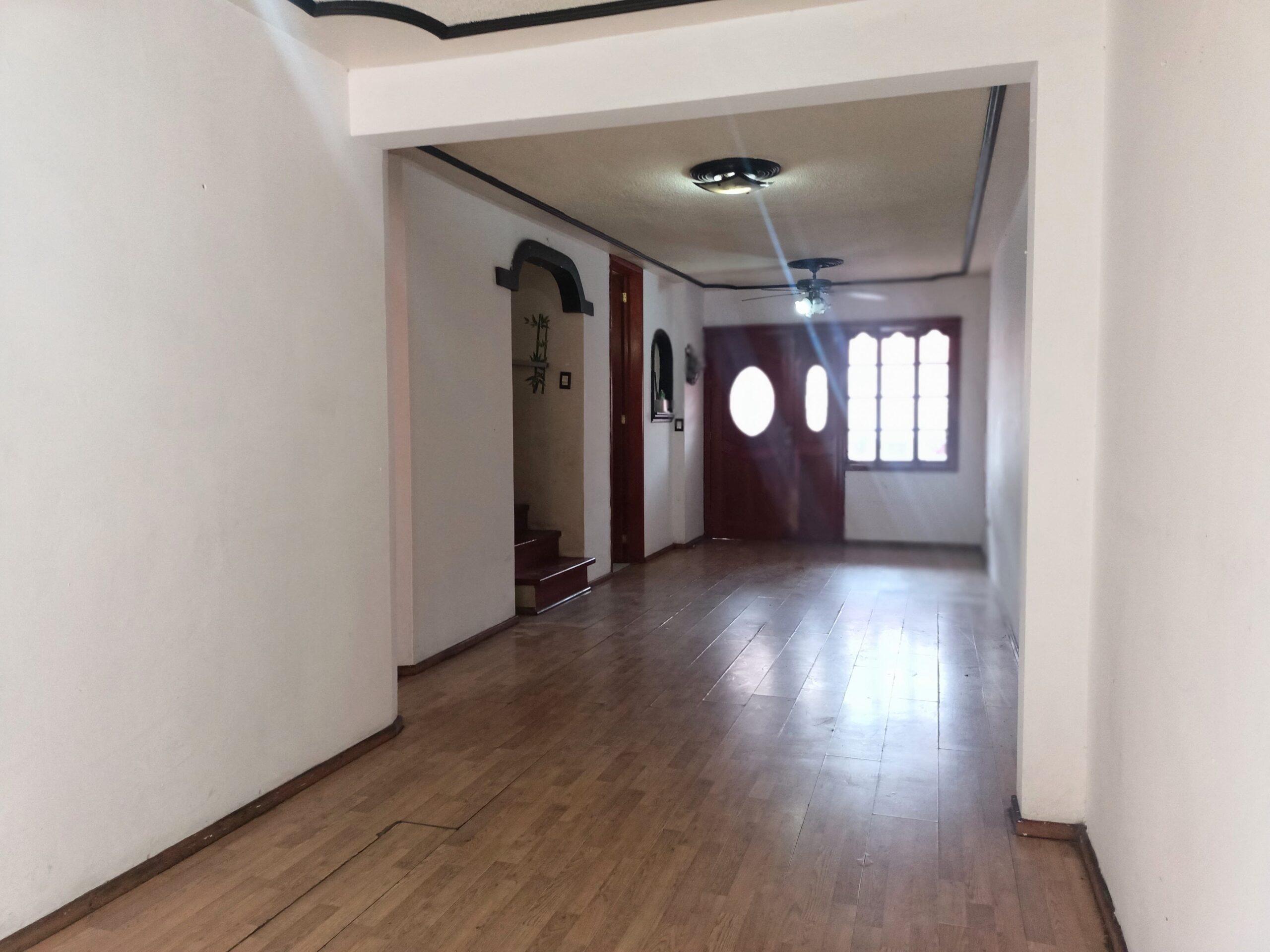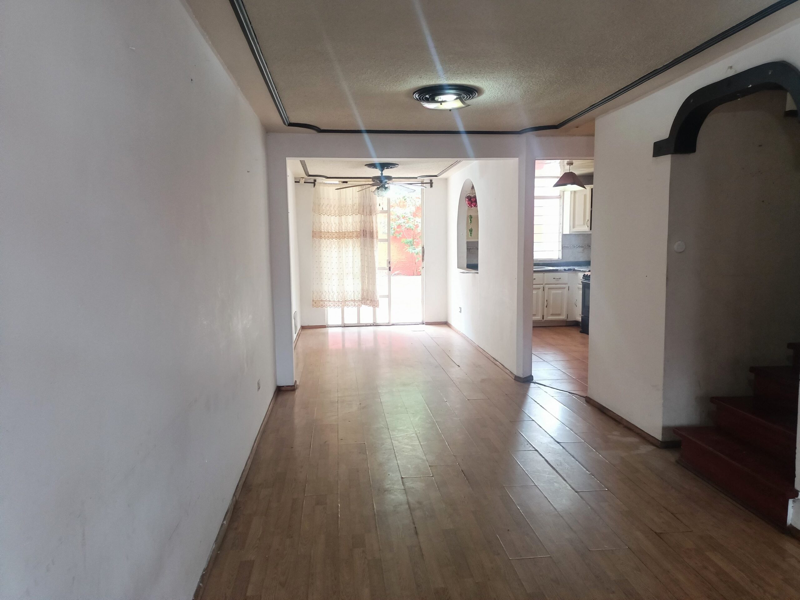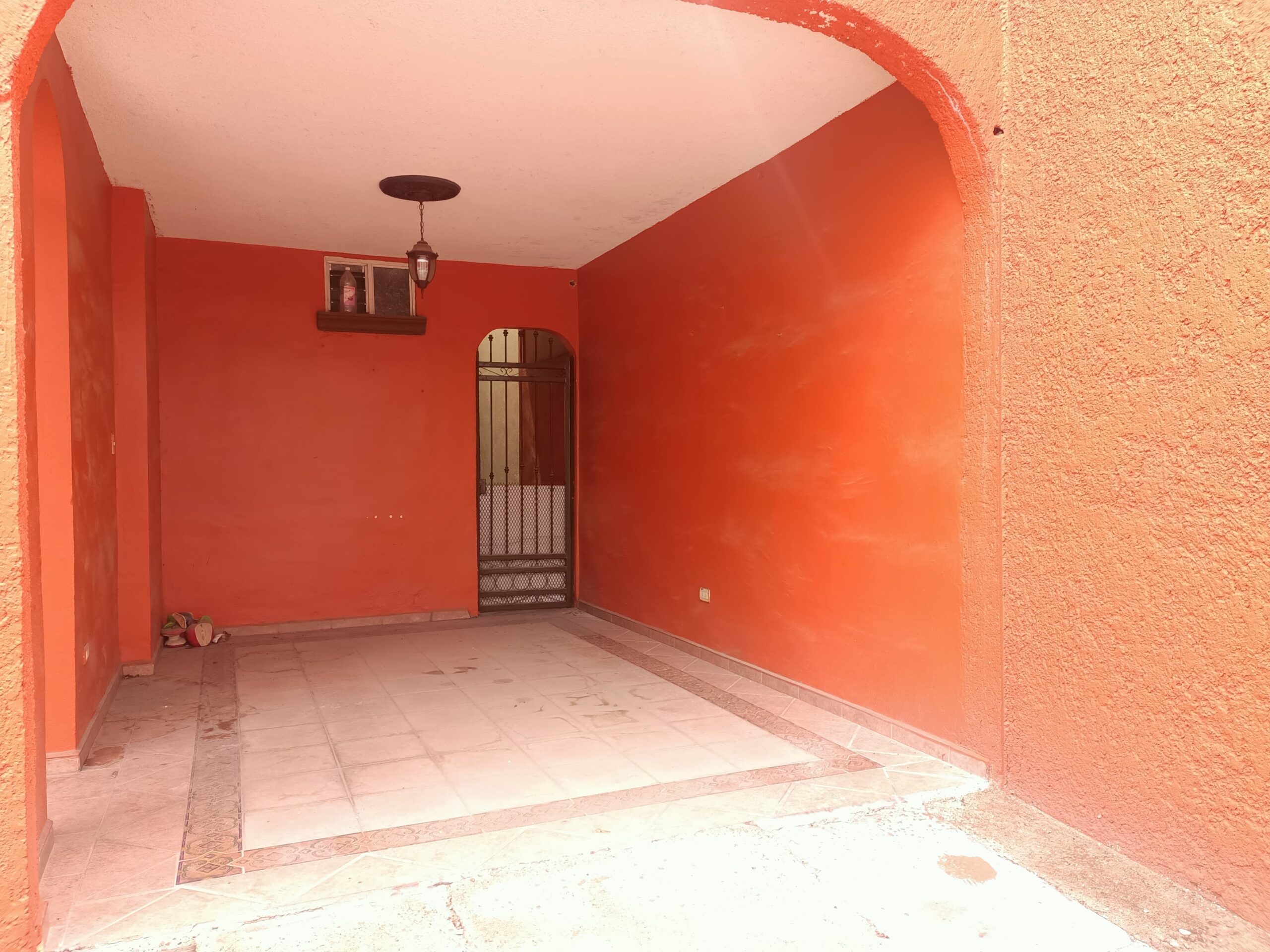 Cochera techada para 2 autos con barandal, sala, comedor, cocina equipada con alacena, medio baño, patio de servicio, área de lavado, techada, pasillo lateral. calentador de paso, cisterna.