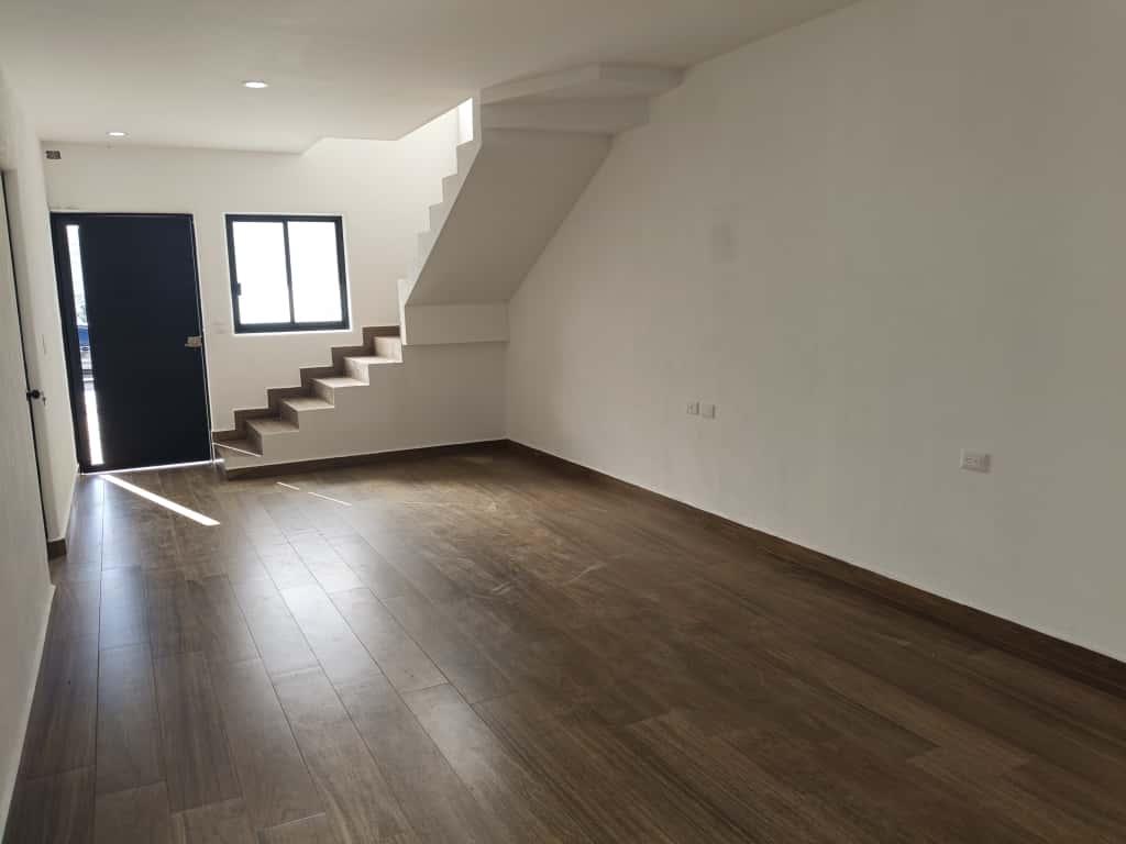 Cochera para 2 autos con barandal, sala, comedor, área para cocina, habitación con baño completo, patio de servicio, cuarto para lavado, cisterna.