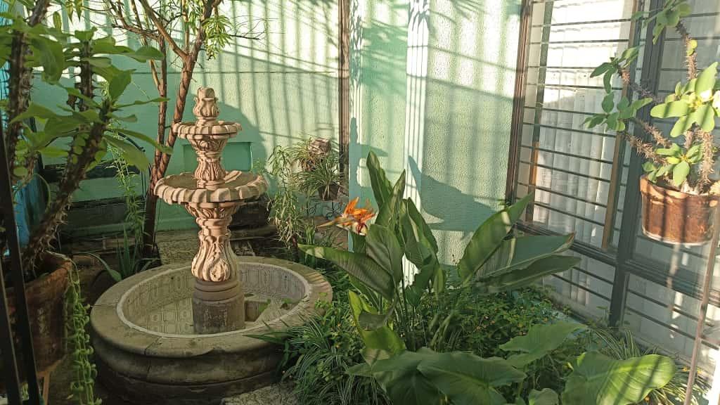 Pequeño jardín y recibidor con elegante cantina de caoba
