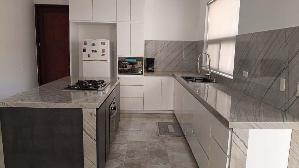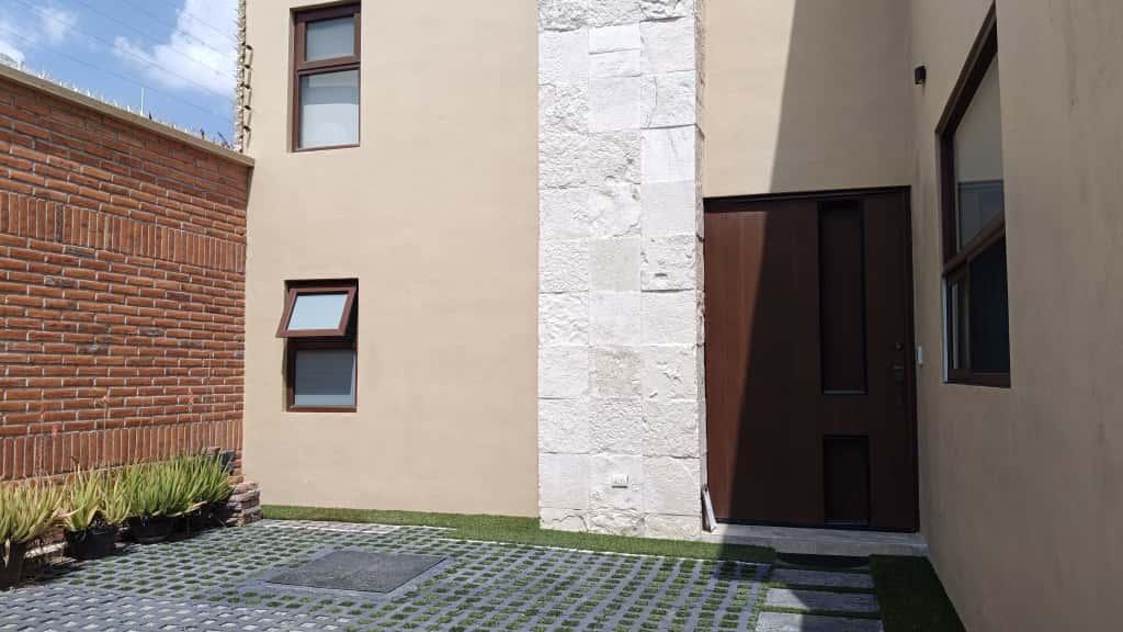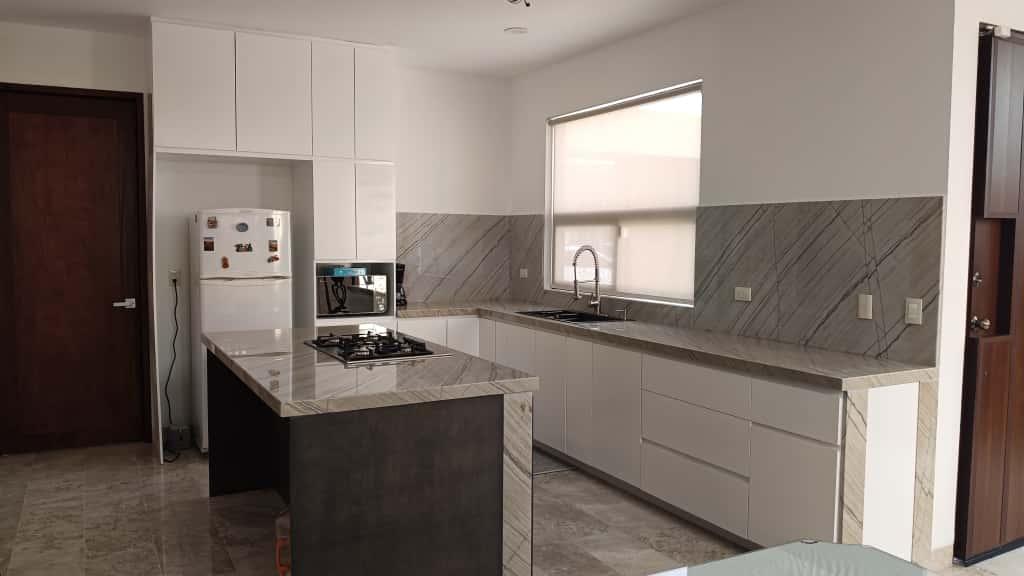 Cochera con portón para 2 autos, fachada adornada con piedra Galarza, recibidor, sala, comedor, con acabados en cantera, cocina equipada de material Cuarcita, con isla de 1.50 X 2 metros, con horno, barra desayunadora, habitación con clóset y baño completo con cancel, (Aluminio Español), cuarto para lavado, patio decorado, piso travertino en toda la casa. cisterna, calentador de paso e hidronumático.
